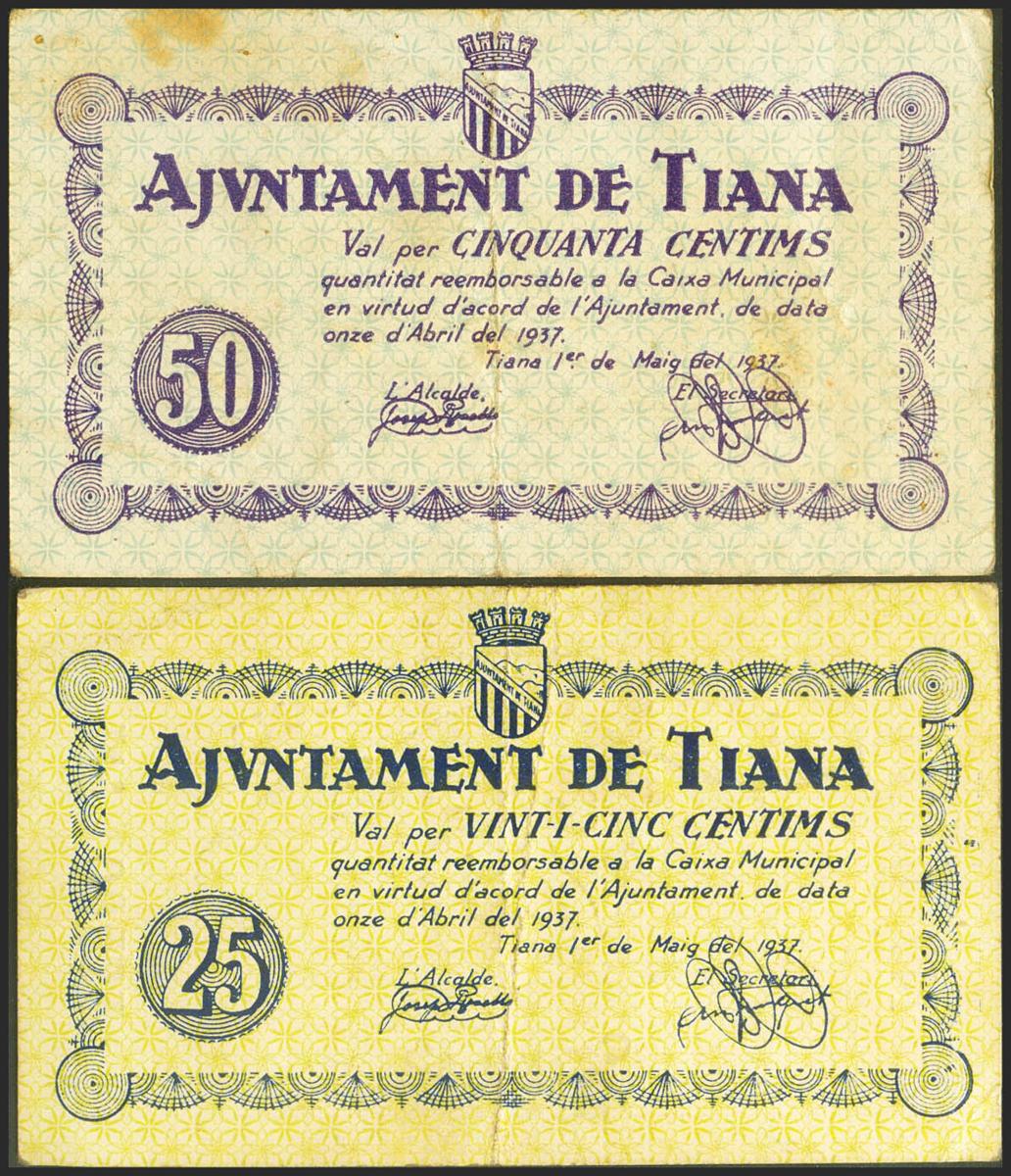 TIANA (BARCELONA). 25 Cents and 50 Cents. May 1, 1937. (González: 10257, 10258). rare. Very Fine.