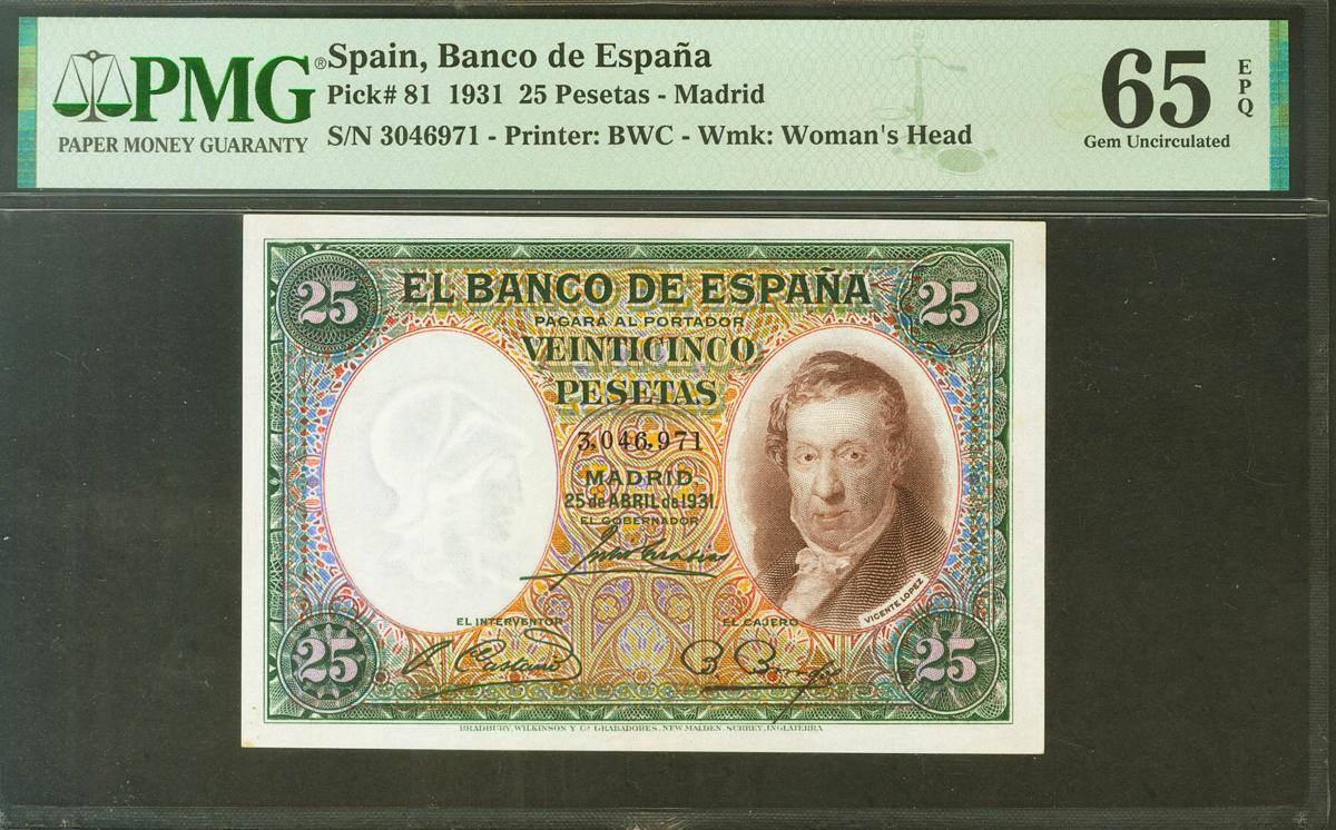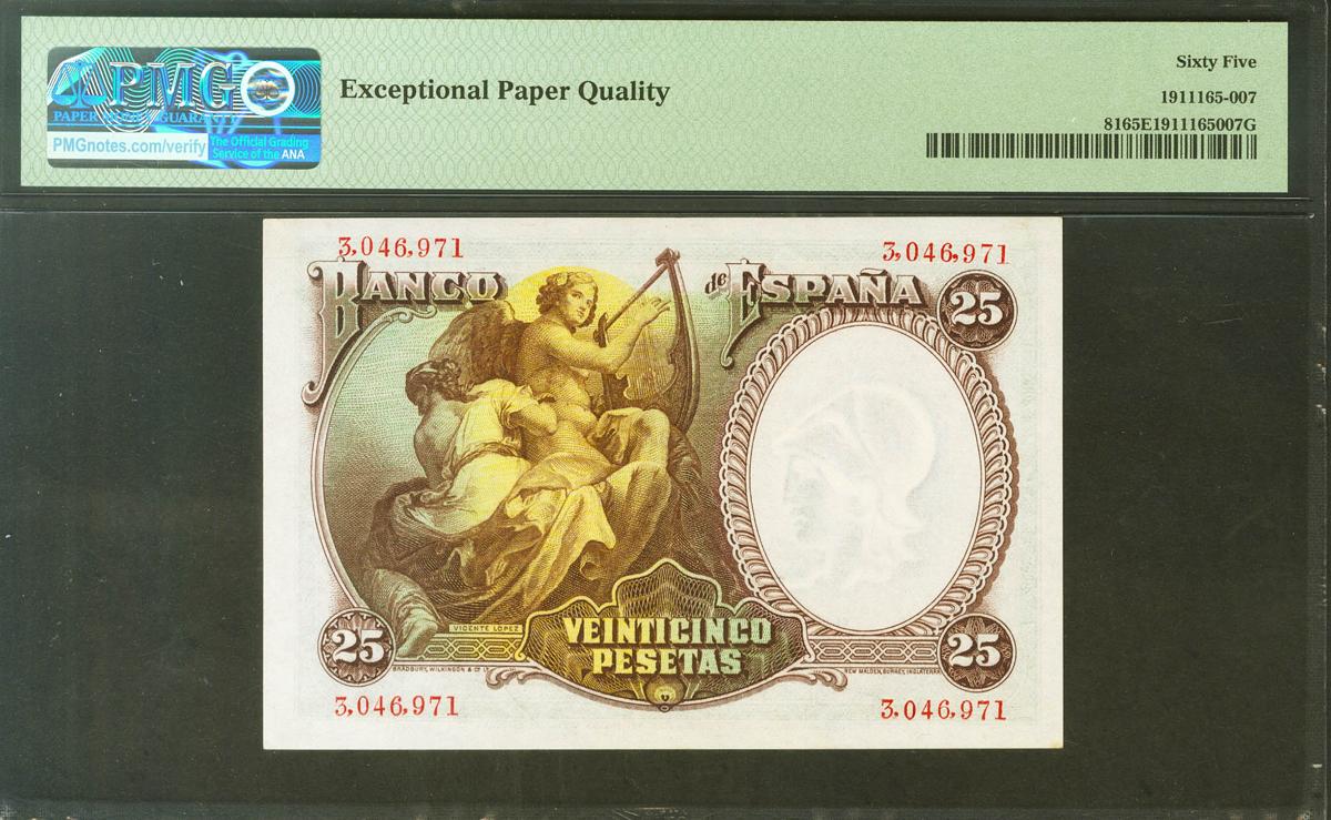 25 pesetas. April 25, 1931. No series. (Edifil 2021: 358, Pick: 81). Rare in this exceptional quality, original sizing. Uncirculated. PMG65EPQ package.