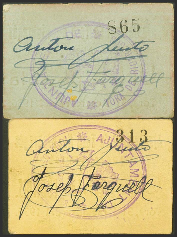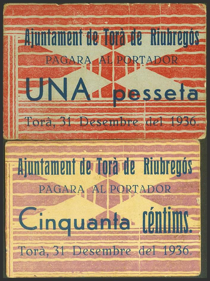 TORA DE RIUBREGOS (LERIDA). 50 Cents and 1 Peseta. December 31, 1936. (González: 10295/96). Rare complete series. Extremely Fine.