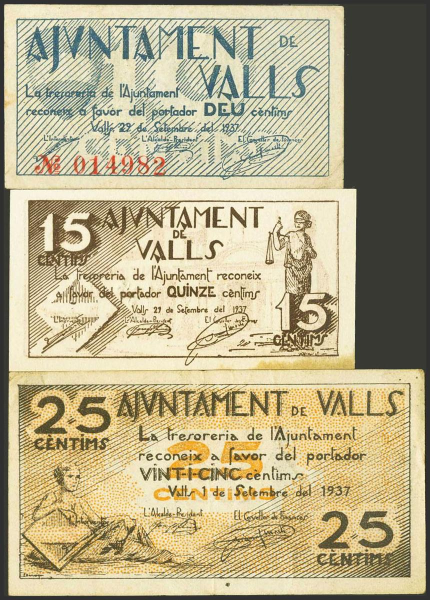 VALLS (TARRAGONA). 10 Cents, 15 Cents and 25 Cents. September 1937. (González: 10545/47). Extremely Fine/ Good Very Fine.