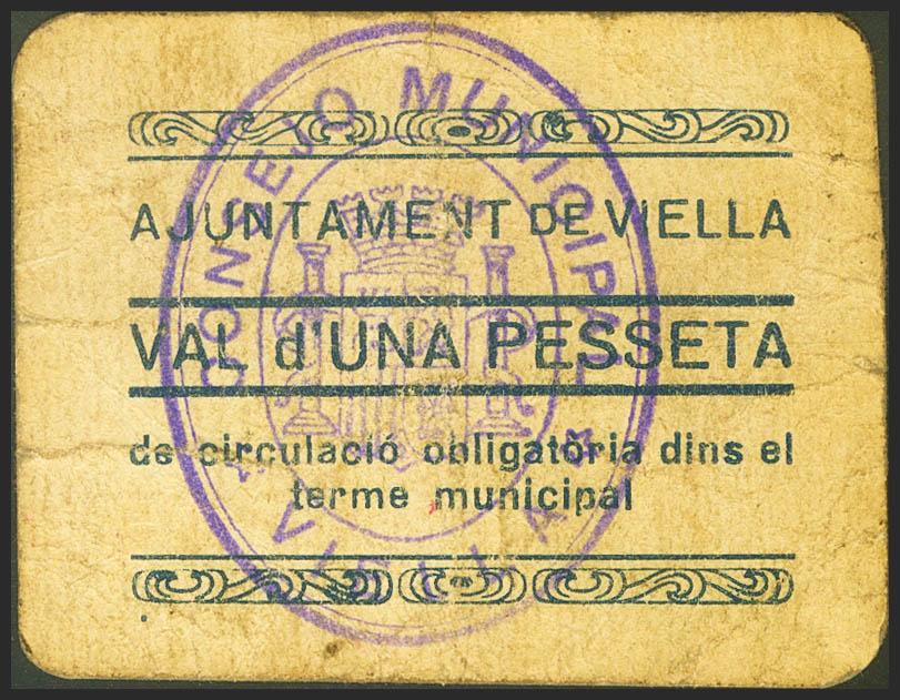 VIELLA (LERIDA). 1 peseta. (1937ca). Series C, without stamp on the back and without numbering. (González: 10657b). Very rare. Extremely Fine.