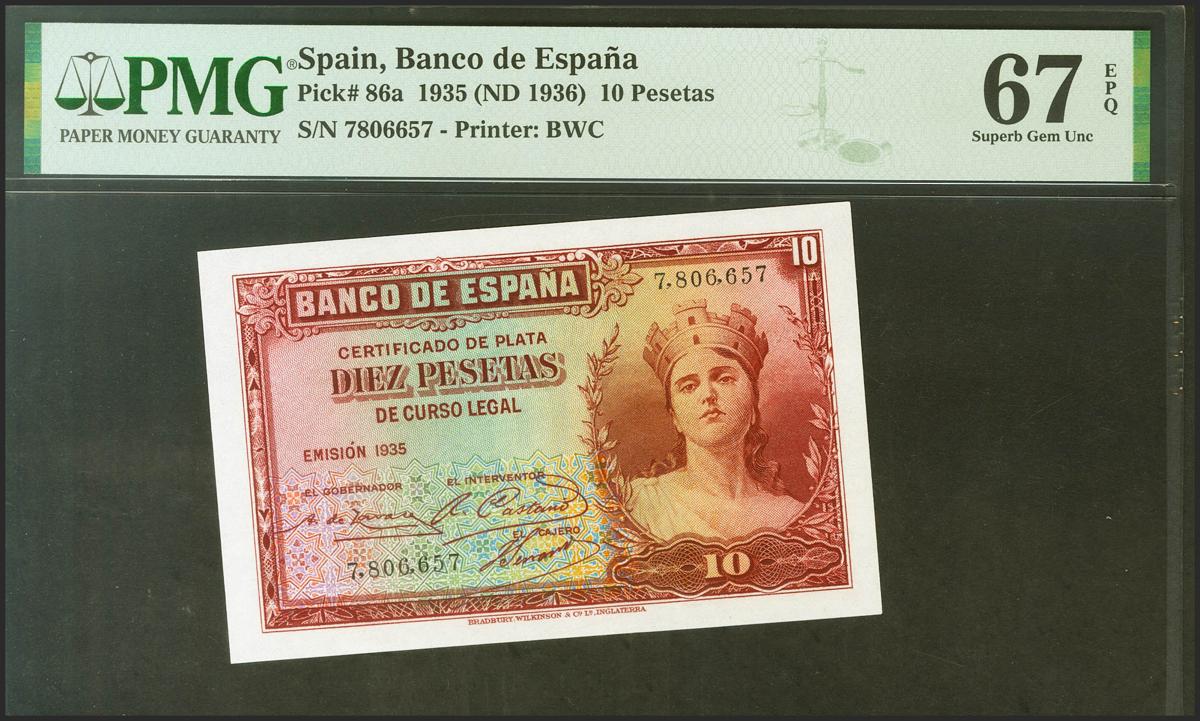 10 pesetas. 1935. No series. (Edifil 2021: 364, Pick: 86). Very rare in this exceptional quality, original sizing. Uncirculated. PMG67EPQ package.