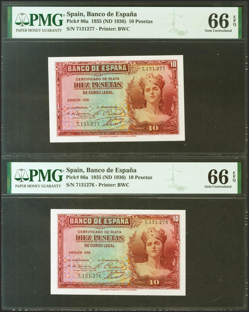 10 pesetas. 1935. Silver Certificate. Correlative pair. No serie. (Edifil 2021: 364, Pick: 86a). Rare pair in this exceptional quality, original sizing. Uncirculated. PMG66EPQ packages, both.