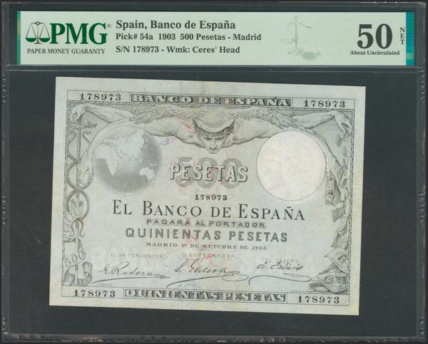 500 pesetas. October 1, 1903. Without series. (Edifil 2017: 311). Extraordinarily rare copy, without a doubt it is the rarest banknote of the entire 20th century, to give us an idea of its rarity since 2015 only 6 copies have been offered at public auction, professionally restored. Extremely Fine. PMG50NET encapsulation. (In order to contextualize its degree of rarity-quality, indicate that as of June 15, 2021, there is only another grade 30 graded PMG note).
