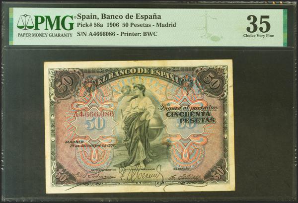 50 pesetas. September 24, 1906. Series A. (Edifil 2021: 315a, Pick: 58a). Good Very Fine. PMG35 package.