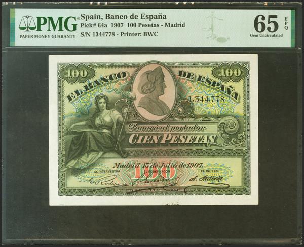 100 pesetas. July 15, 1907. No series. (Edifil 2021: 320, Pick: 64a). Extraordinarily rare, especially in this quality, original sizing. Uncirculated. PMG65EPQ package. (To get an idea of the rarity, as of July 1, 2022, this bill is the best graded along with another copy in PMG)