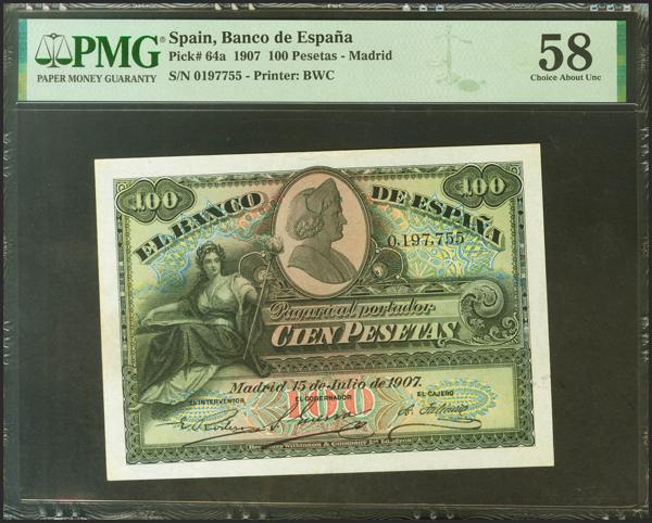 100 pesetas. July 15, 1907. No series. (Edifil 2021: 320, Pick: 64a). Rare in this quality. EBC++. PMG58 encapsulation.