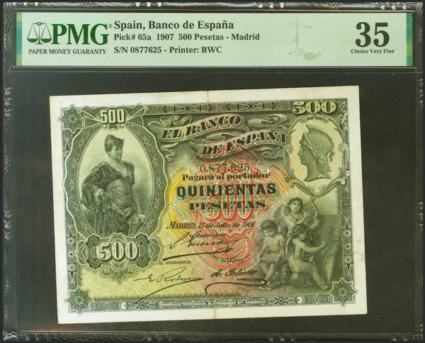 500 pesetas. July 15, 1907. No series. (Edifil 2021: 321, Pick: 65a). Minimally repaired. Extremely Fine. PMG35 package.