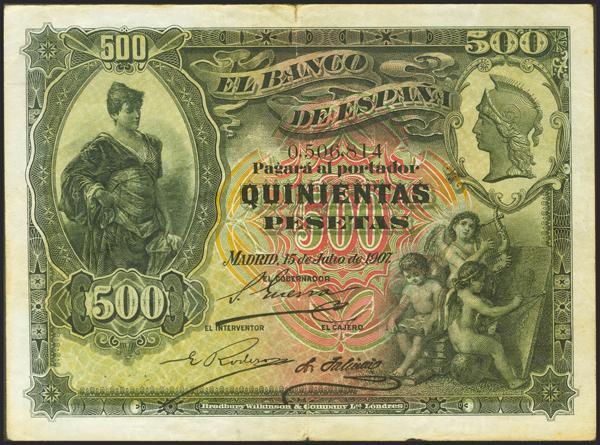 500 pesetas. June 15, 1907. No series. (Edifil 2021: 321). Rare, especially without repairs. Very Fine.