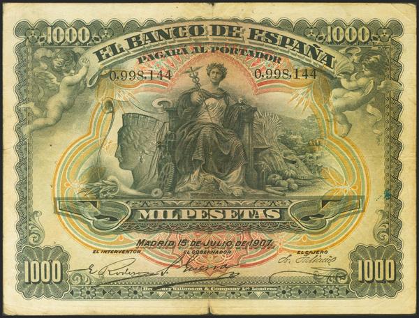 1000 pesetas. July 15, 1907. No series. (Edifil 2021: 322). Unusual and with needle points, banknote without repairs. Very Fine.