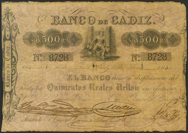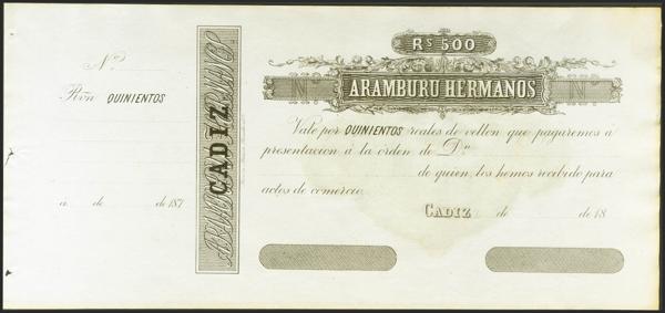 500 Reales de Fleece. (1870ca). Aramburu Hermanos, Cádiz (parent company on the left). To better understand the contextualization of this banknote, we recommend the work "Obligations, vouchers and documents put into circulation as paper money in Spain", by Don Ramón Cobo Huici. Almost Uncirculated
