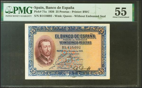 25 pesetas. October 12, 1926. Series B, last series issued. (Edifil 2021: 325a, Pick: 71a). Rare in this quality. Good Extremely Fine. PMG55 package.