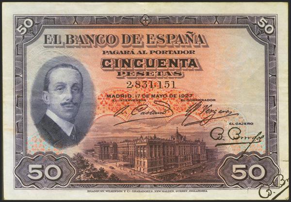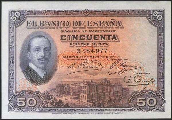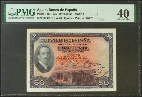 50 pesetas. May 17, 1927. No series. (Edifil 2021: 326, Pick: 72a). Extremely Fine. PMG40 package.