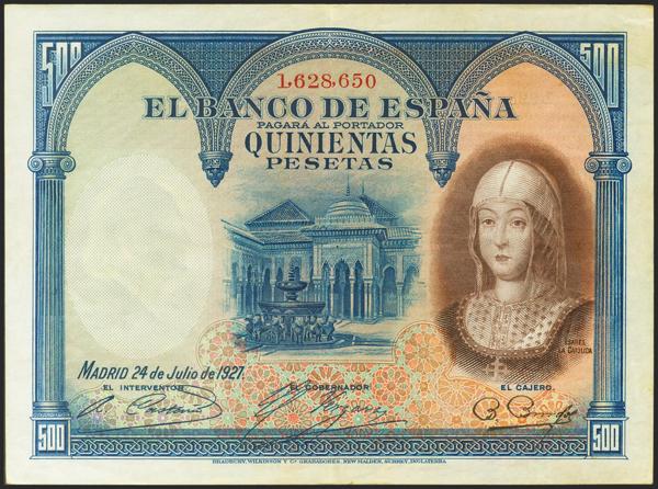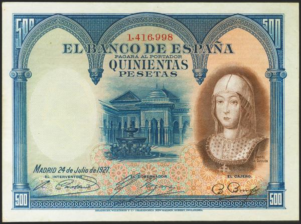 500 pesetas. July 24, 1927. Without series and numbering after 1602000. (Edifil 2021: 352). Unusual, it retains part of its original sizing. Almost Extremely Fine.