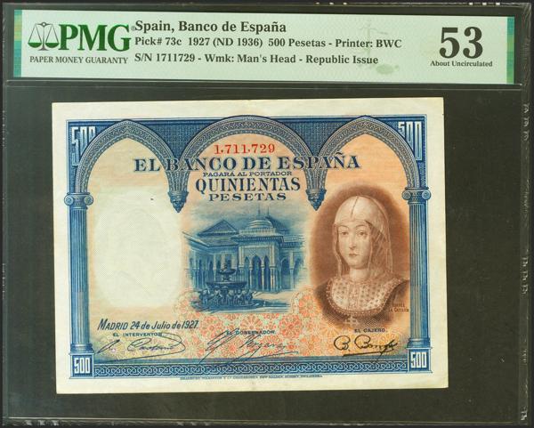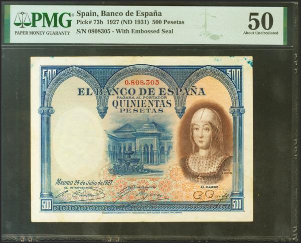 500 pesetas. July 24, 1927. Without series and numbering prior to 1602000. (Edifil 2021: 327, Pick: 73b). Very rare, ink spots. Extremely Fine. PMG50 package.