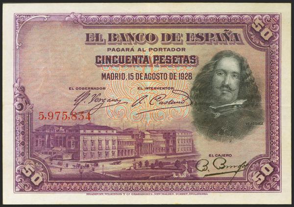 50 pesetas. August 15, 1928. No series. (Edifil 2021: 329). It retains some original sizing. Good Very Fine.