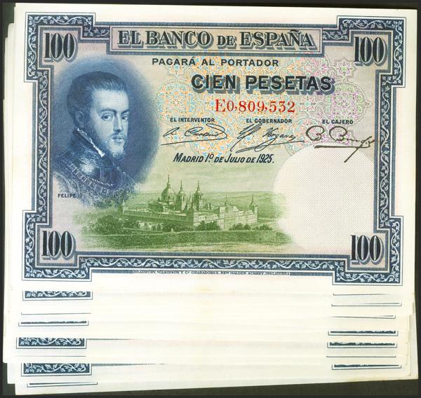 Set of 20 banknotes in correlative sections of 100 Pesetas issued on July 1, 1925 with the E series (Edifil 2021: 350), preserving all its original size. Good Extremely Fine.