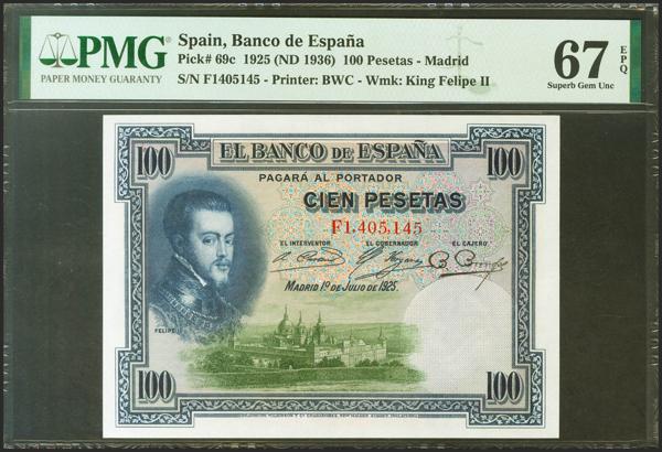 100 pesetas. June 1, 1925. Series F. (Edifil 2021: 350, Pick: 69c). Rare in this exceptional quality, original Uncirculated sizing. PMG67EPQ package.