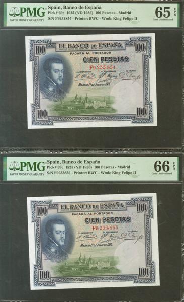 100 pesetas. July 1, 1925. Correlative couple. Series F. (Edifil 2021: 350, Pick: 69c). original sizing PMG66/65EPQ package.