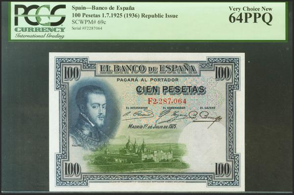 100 pesetas. July 1, 1925. Series F. (Edifil 2021: 350, Pick: 69c). original sizing Uncirculated. PCGS64PPQ package.