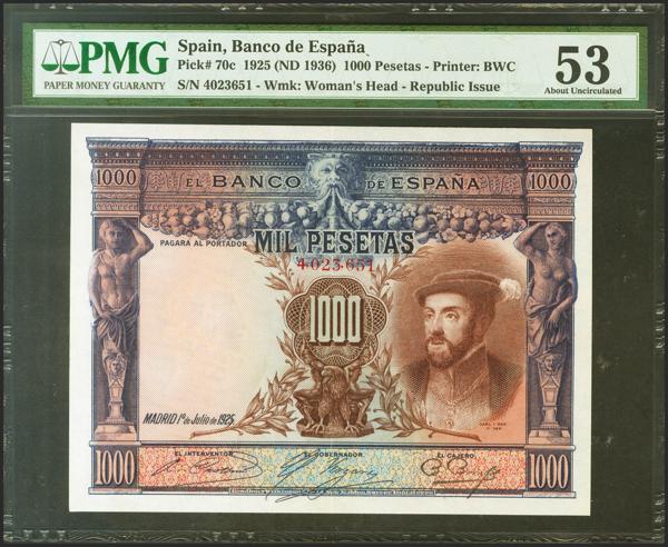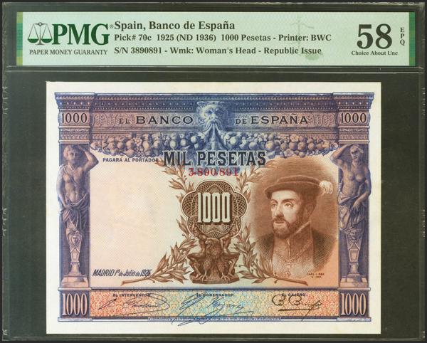 1000 pesetas. July 1, 1925. Without series and numbering greater than 3646000. (Edifil 2021: 351, Pick: 70c). Rare in this quality, original sizing. EBC+++. PMG58EPQ package.