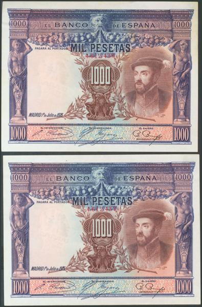 1000 pesetas. July 1925. Correlative couple. No serie. (Edifil 2017: 351). It retains much of its original sizing, very attractive. Extremely Fine.