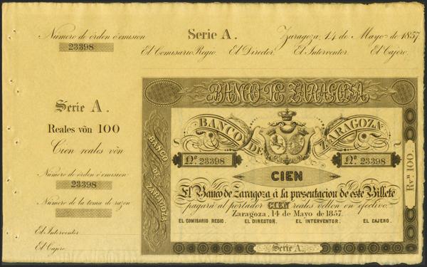 100 Reales. May 14, 1857. Bank of Zaragoza. Series A and with matrix. (Edifil 2021: 126B). original sizing Uncirculated.
