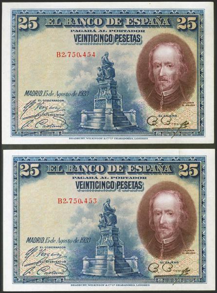 25 pesetas. August 15, 1928. Correlative couple. Series B. (Edifil 2021: 353). original sizing Almost Uncirculated.