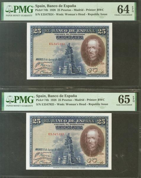 25 pesetas. August 15, 1928. Correlative couple. Series B. (Edifil 2021: 353). original sizing Uncirculated. PMG64/65EPQ package.