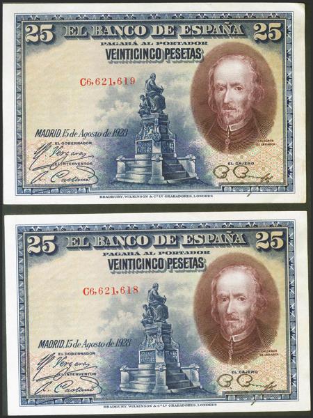 25 pesetas. August 15, 1928. Correlative couple. Series C. (Edifil 2021: 353). original sizing Almost Uncirculated.