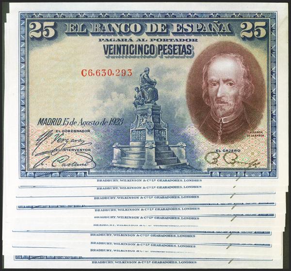 Precious set of 10 correlative banknotes of 25 Pesetas issued on August 15, 1928 with series C (Edifil 2021: 353), preserving all its original size. Uncirculated/ Almost Uncirculated.