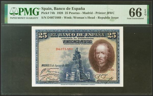 25 pesetas. August 15, 1928. Series D. (Edifil 2021: 353, Pick: 74b). Rare in this exceptional quality, original sizing. Uncirculated. PMG66EPQ package.