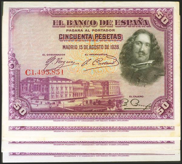 Set of 10 banknotes, mostly correlative and in different sections of 50 Pesetas issued on August 15, 1928 and with series C (Edifil 2021: 354), preserving most of the original size. Good Extremely Fine/ Extremely Fine.