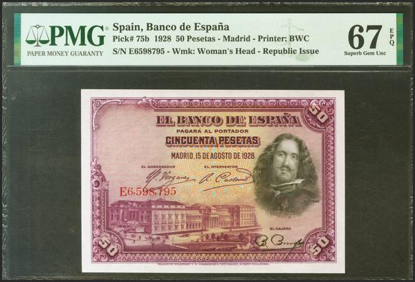 50 pesetas. August 15, 1928. Series E, last series issued. (Edifil 2021: 354, Pick: 75b). Rare in this exceptional quality, original sizing. Uncirculated. PMG67EPQ package.