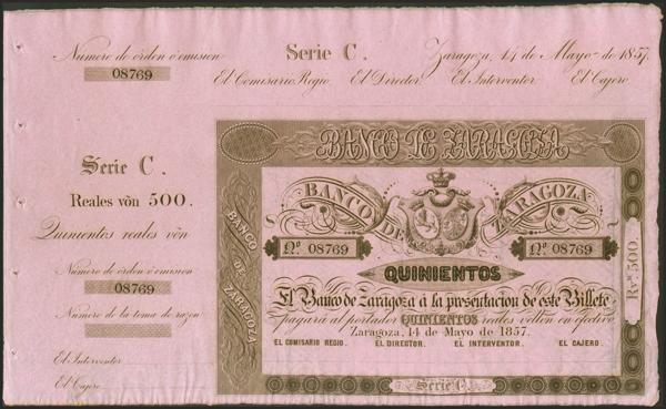 500 Reales. May 14, 1857. Bank of Zaragoza. Series C and with matrix. (Edifil 2021: 128B). original sizing Uncirculated.