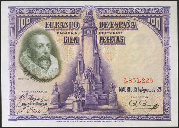 100 pesetas. August 15, 1928. No series. (Edifil 2021: 355, Pick: 76a). Rare in this superlative quality, it retains all its original sizing. Uncirculated.