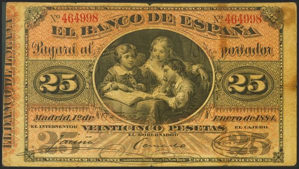 25 pesetas. January 1, 1884. Without series. (Edifil 2021: 282). Rare without any repair, ALICANTE stamp stamped on the back. Almost Very Fine.