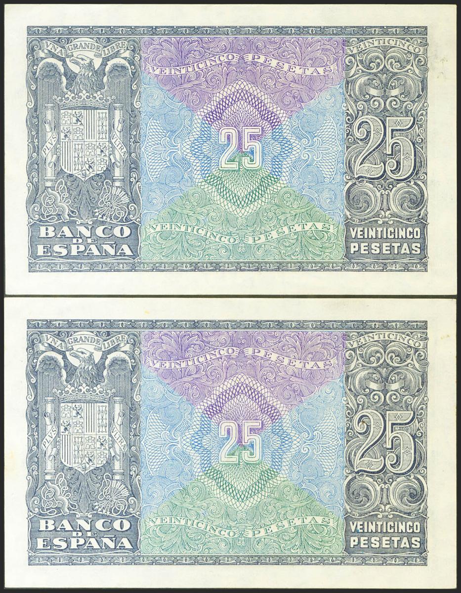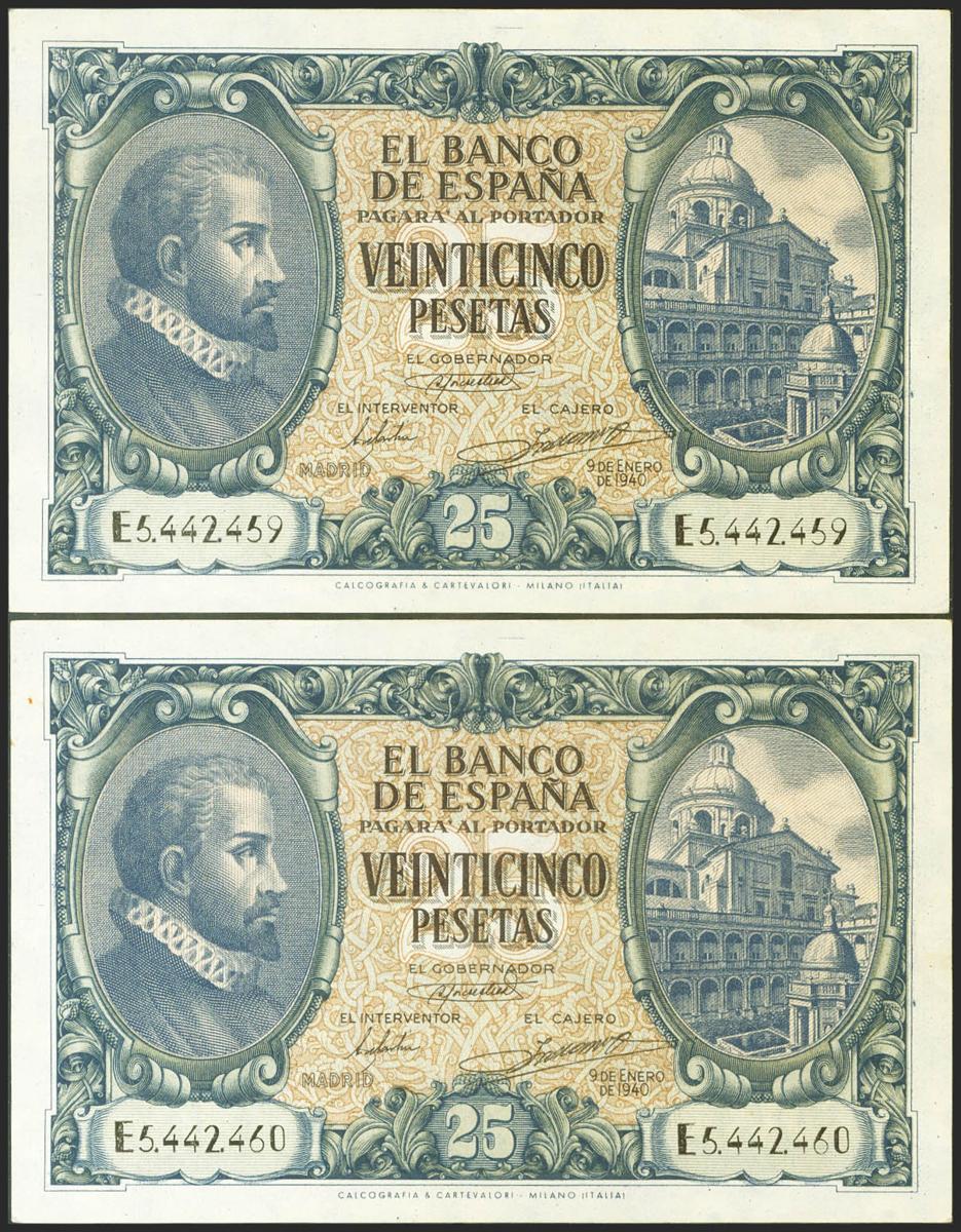 25 pesetas. January 9, 1940. Correlative couple. Series E. (Edifil 2021: 436a). Rare, especially in this quality, it retains all of its original sizing. Almost Uncirculated.