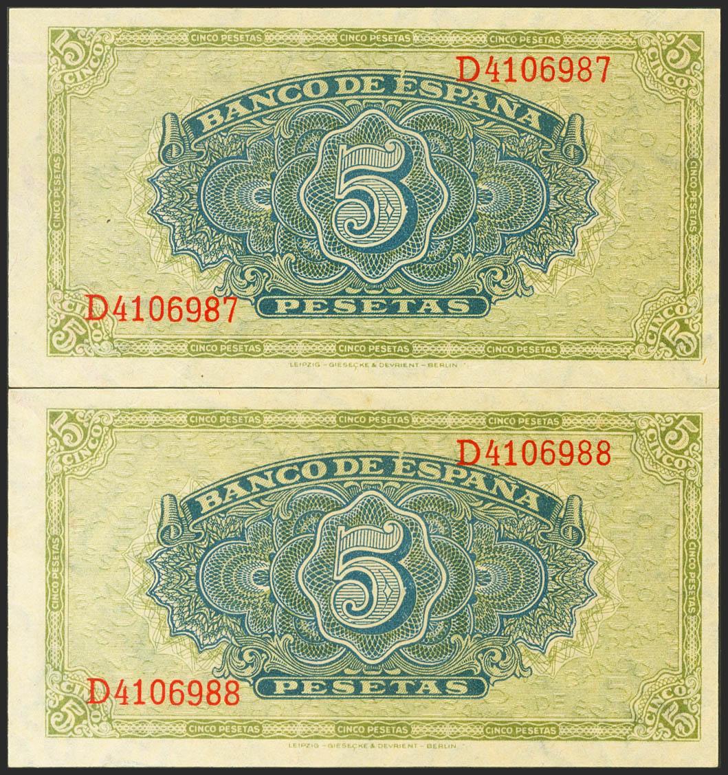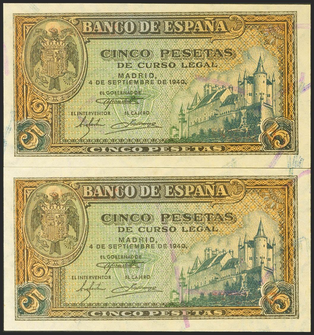 5 pesetas. September 4, 1940. Correlative couple. Series D. (Edifil 2021: 443a, Pick: 123a). It retains all its original sizing. EBC++.