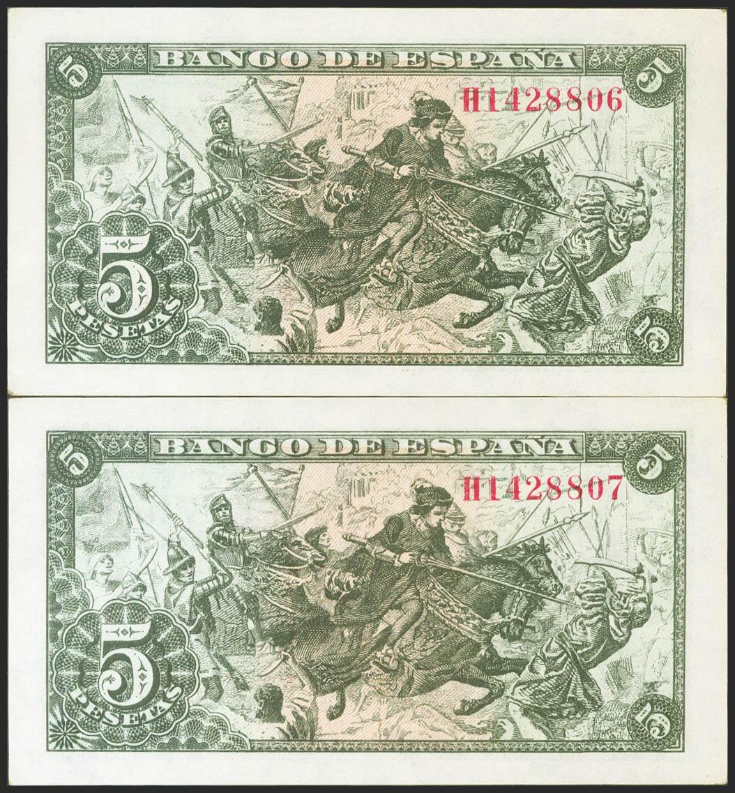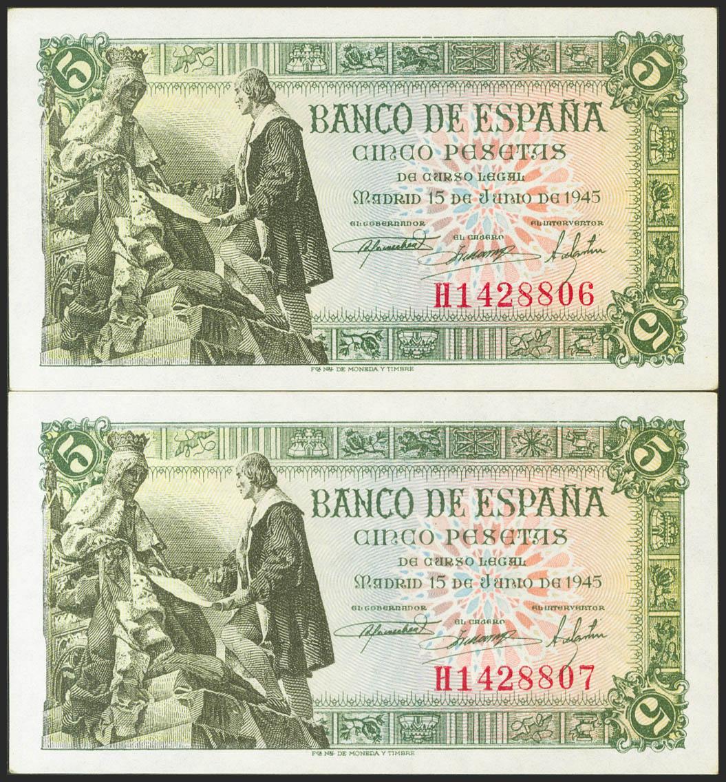 English 5 pesetas. June 15, 1945. Correlative couple. Series H. (Edifil 2021: 449a, Pick: 129a). It retains all its original sizing. Almost Uncirculated.