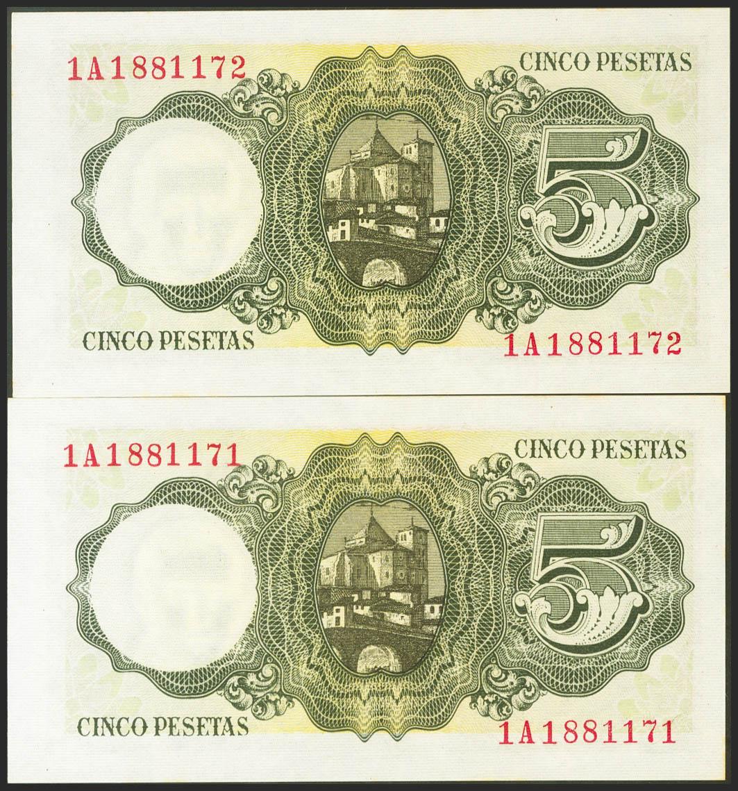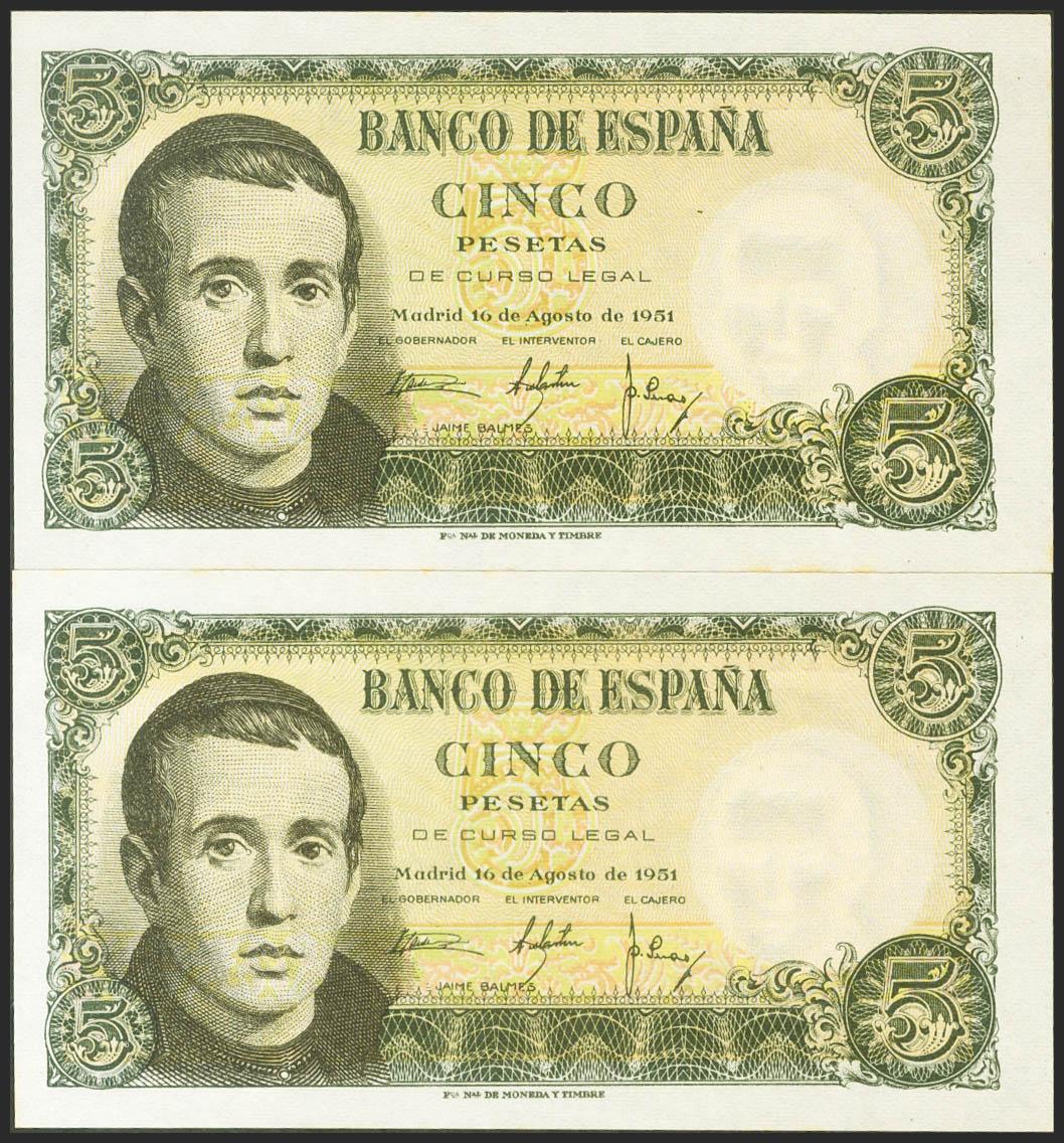 English 5 pesetas. August 16, 1951. Correlative couple. Series 1A. (Edifil 2021: 459a). original sizing Uncirculated.