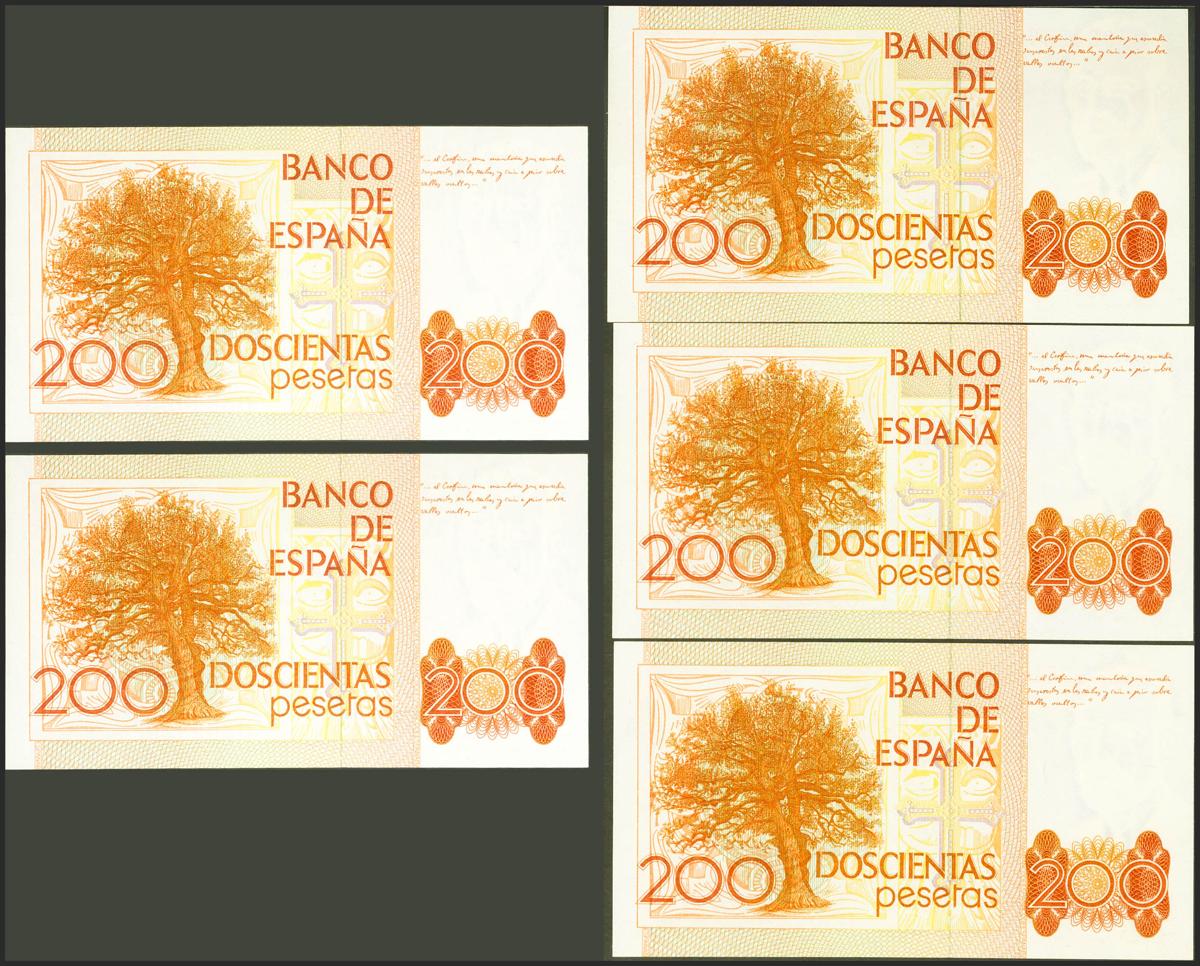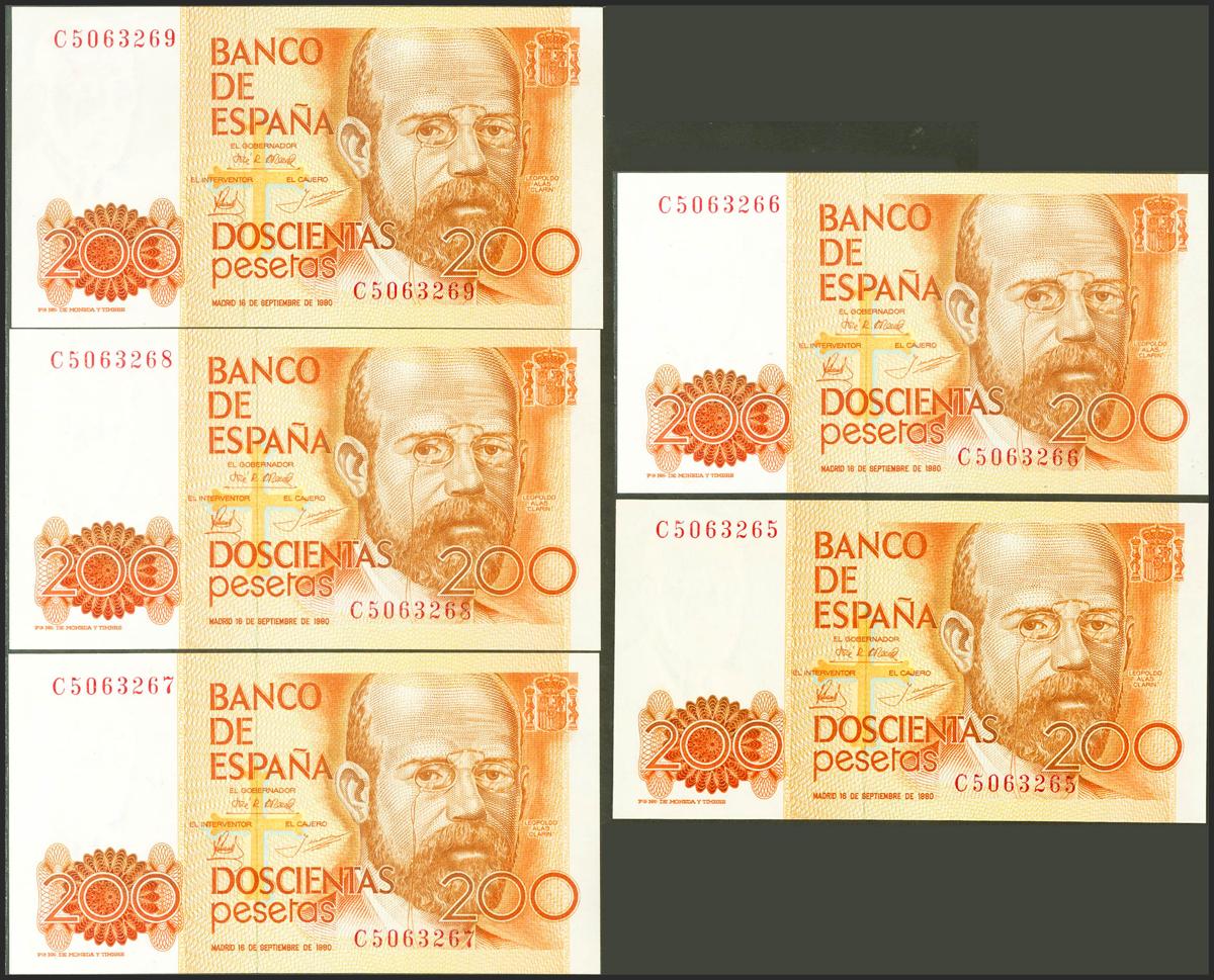 Set of 5 correlative banknotes of 200 Pesetas, issued on September 16, 1980, all of them with the C series (Edifil 2021: 480a). Uncirculated.