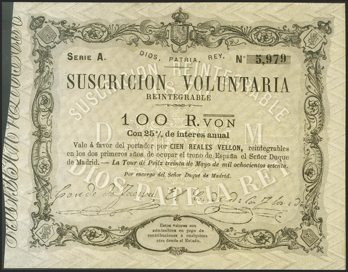 100 Reales de Fleece. May 30, 1870. Issue of Tour de Peilz. Series A. (Edifil 2021: 196). Extremely Fine.