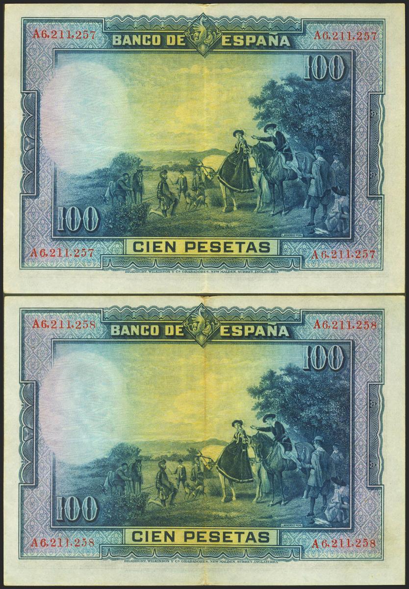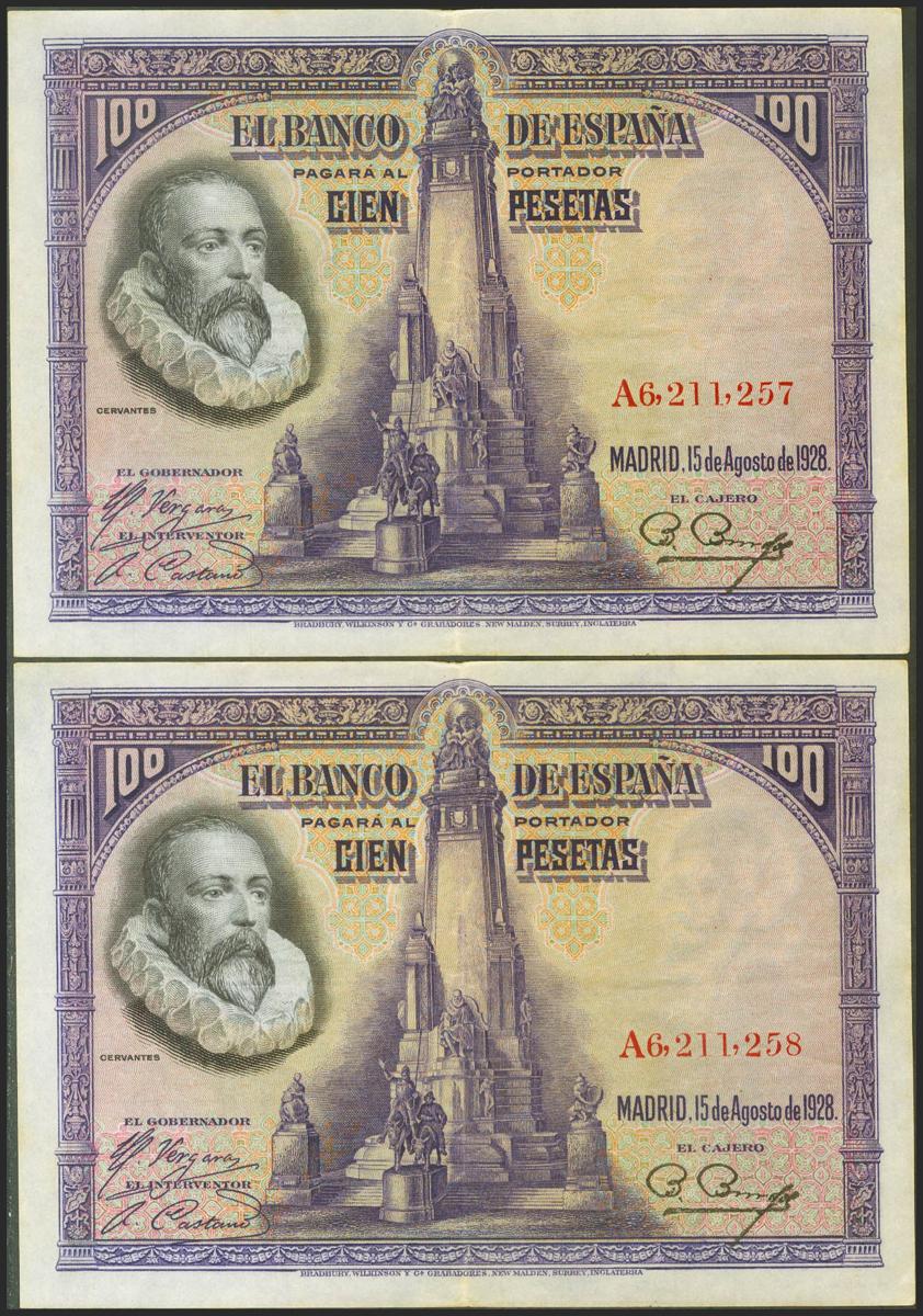 100 pesetas. August 15, 1928. Correlative couple. Series A. (Edifil 2021: 355a). It retains part of the original sizing. Almost Extremely Fine.