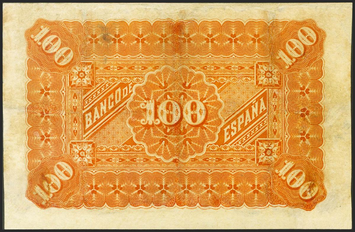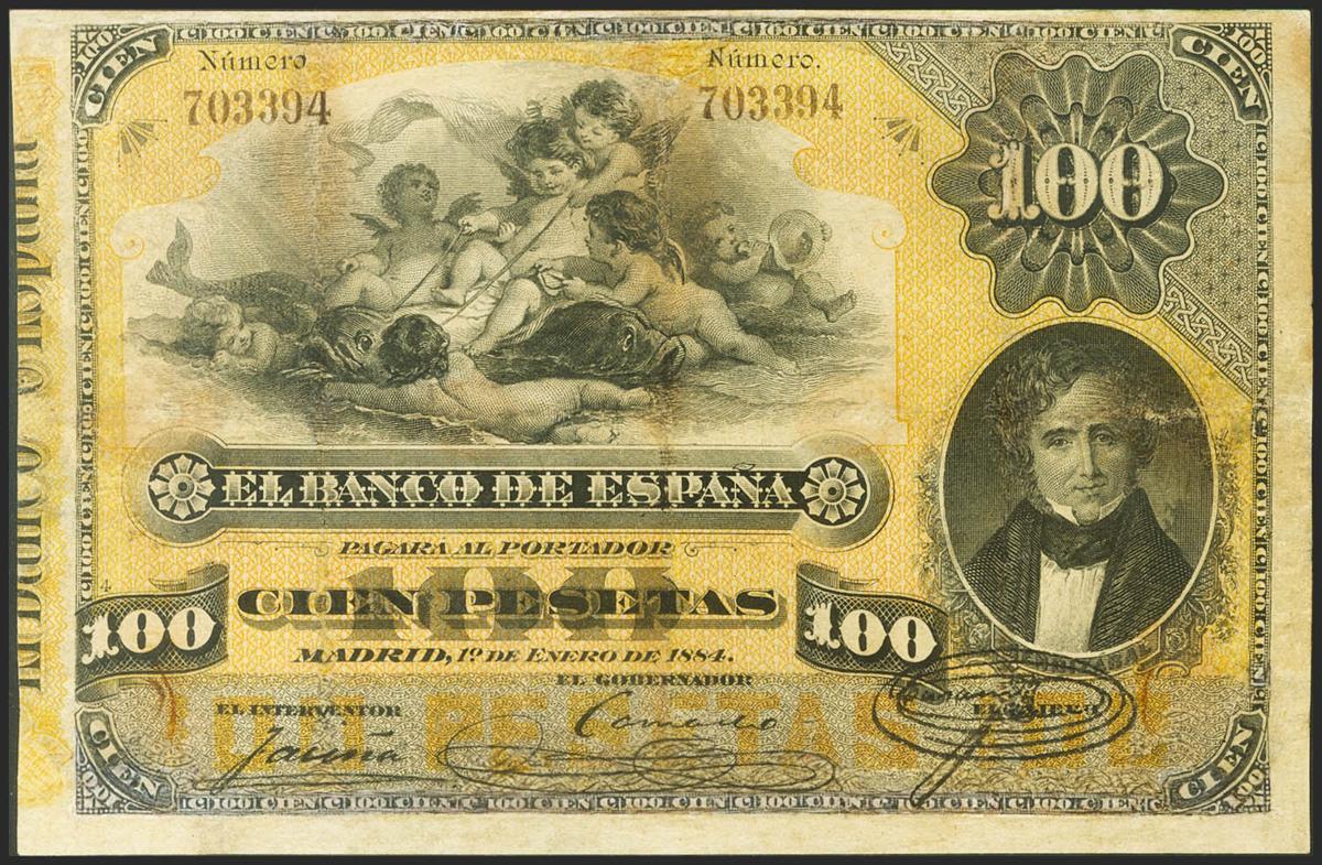 100 pesetas. January 1, 1884. Without series. (Edifil 2017: 284). Rare and professionally restored, ticket with a huge presence. Very Fine.