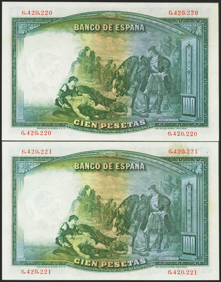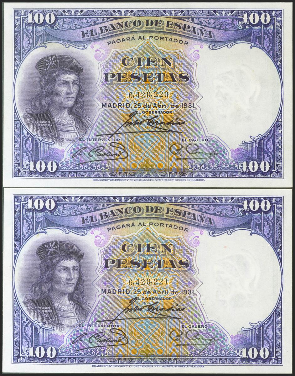 100 pesetas. April 25, 1931. Correlative couple. No serie. (Edifil 2021: 360). It retains part of its original size. Good Extremely Fine.