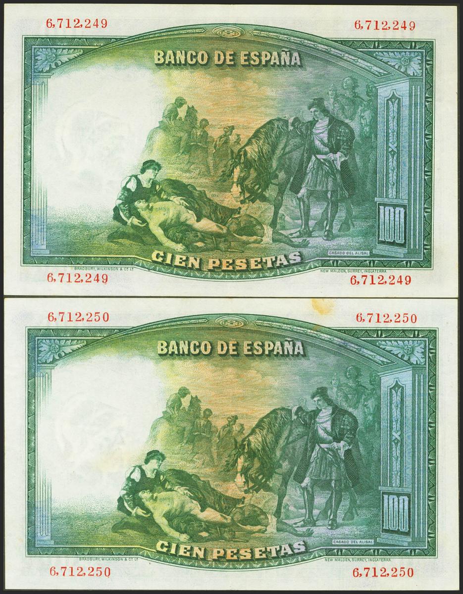 100 pesetas. April 25, 1931. Correlative couple. No serie. (Edifil 2021: 360). It retains part of its original size. Extremely Fine.