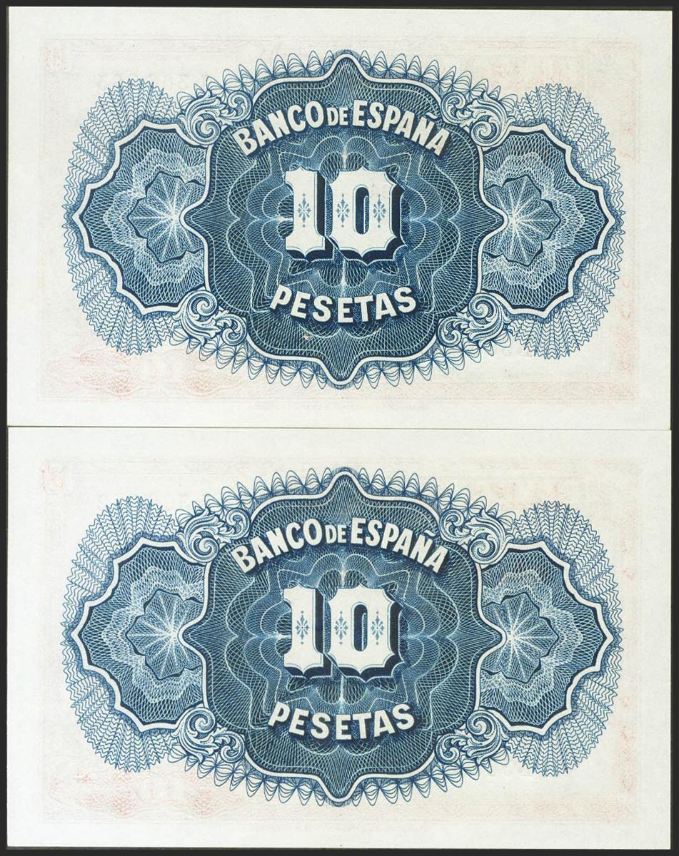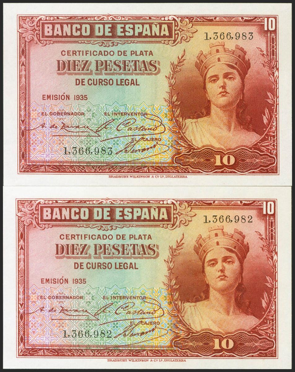 10 pesetas. 1935. Silver Certificate. Correlative pair. No serie. (Edifil 2017: 364). original sizing Uncirculated.
