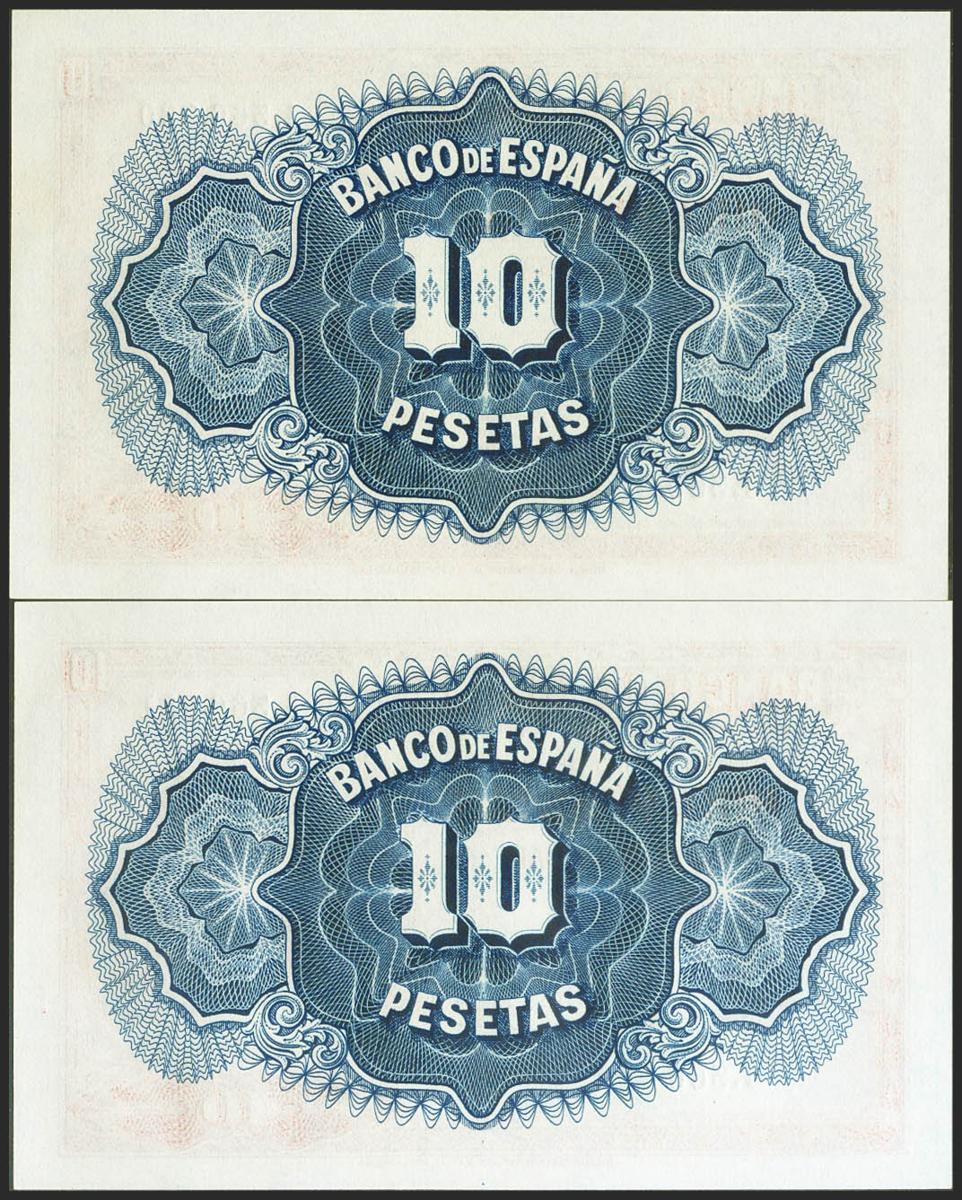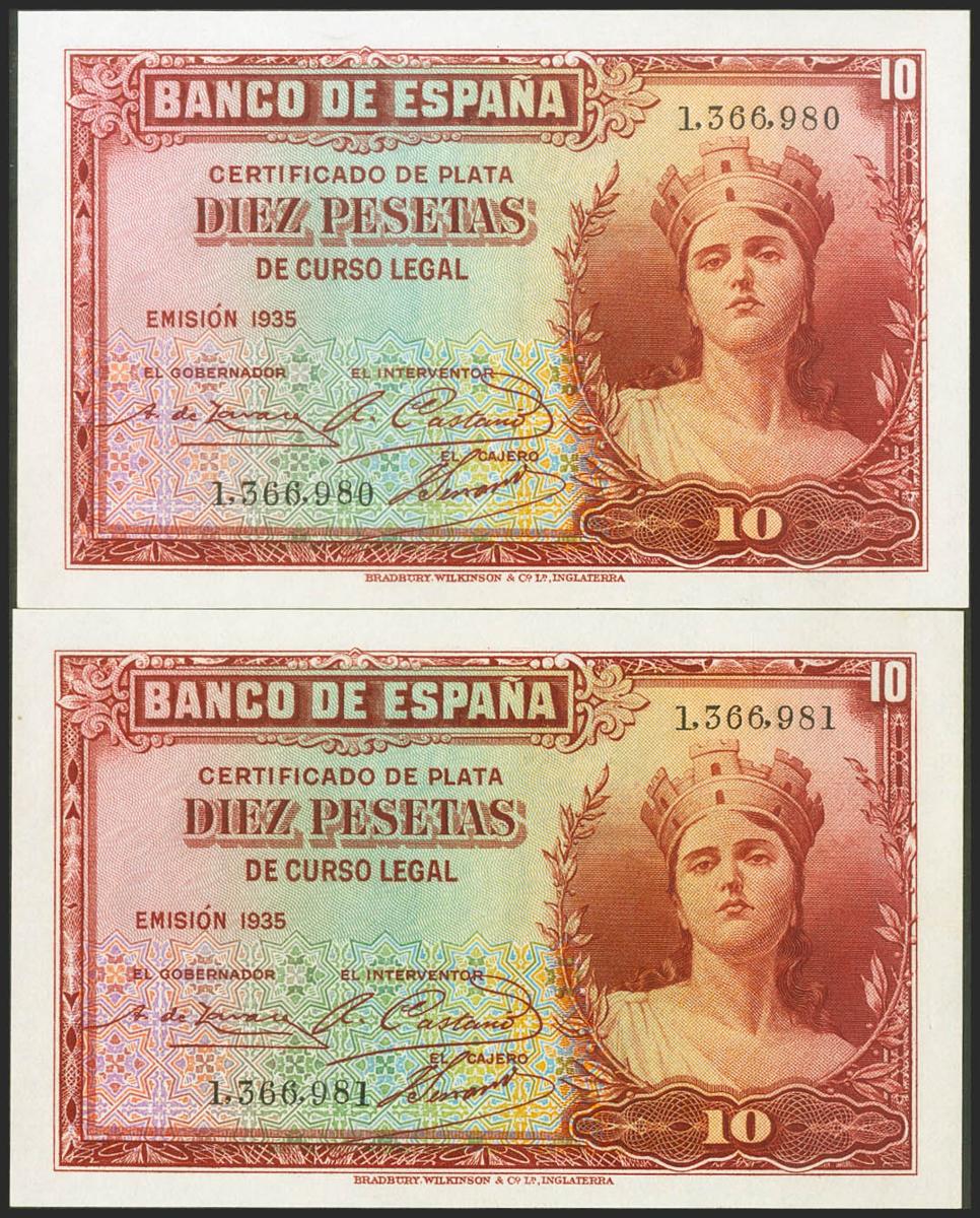 10 pesetas. 1935. Silver Certificate. Correlative pair. No serie. (Edifil 2017: 364). Original Sizing (Bradbury Cue Band is included). Uncirculated.