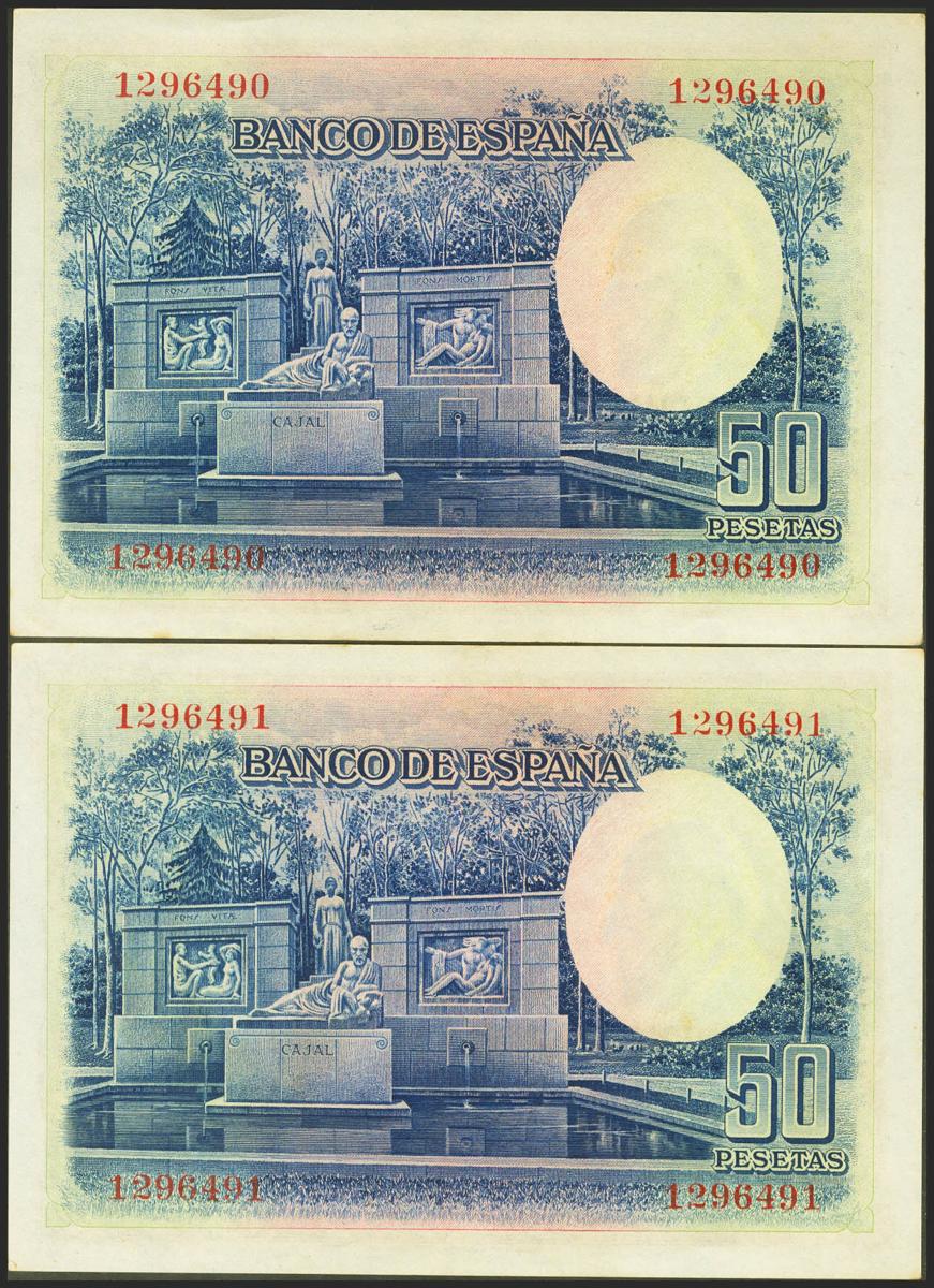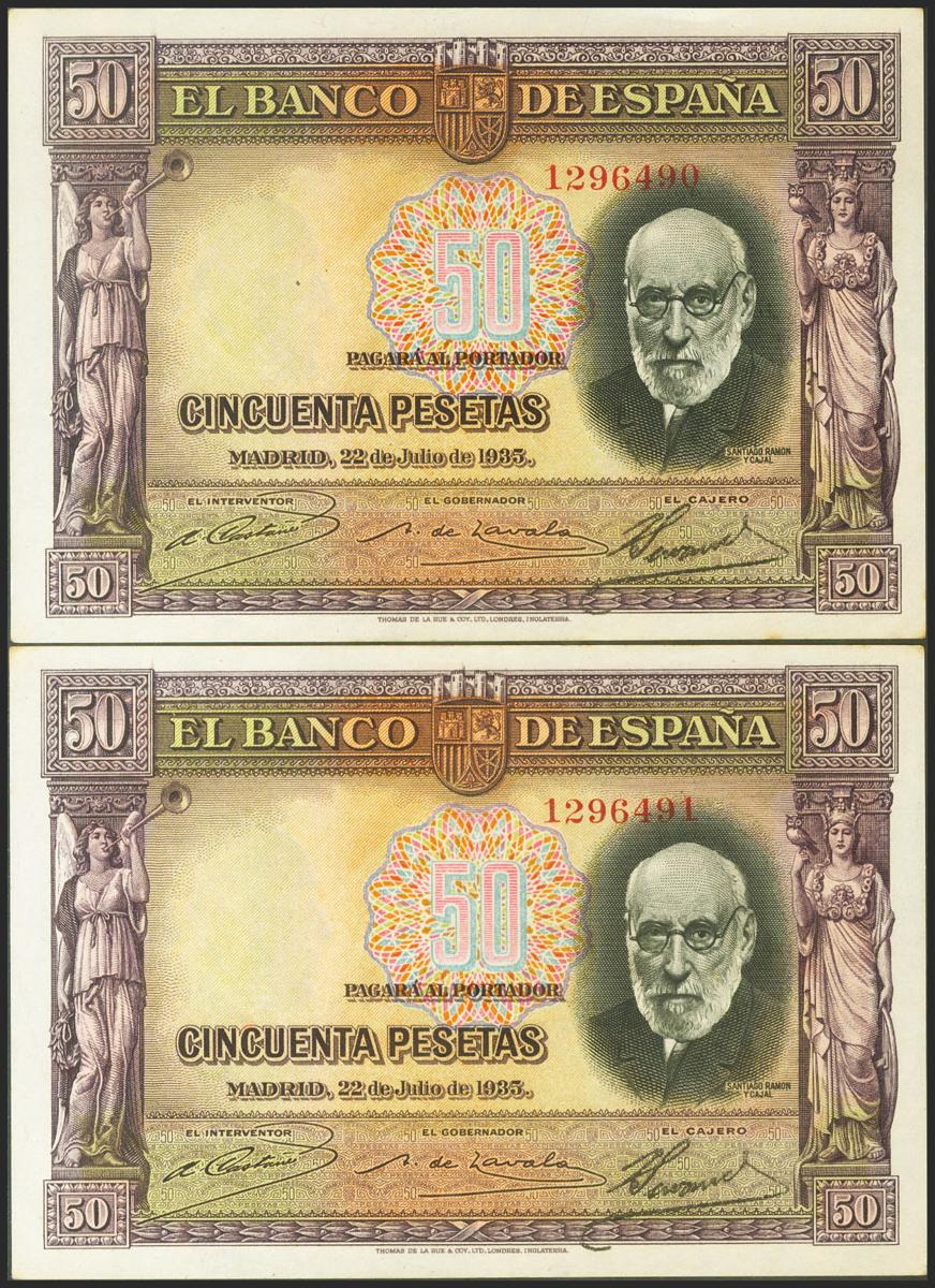 50 pesetas. July 22, 1935. Correlative couple. No serie. (Edifil 2021: 366). It retains part of the original sizing. Extremely Fine.